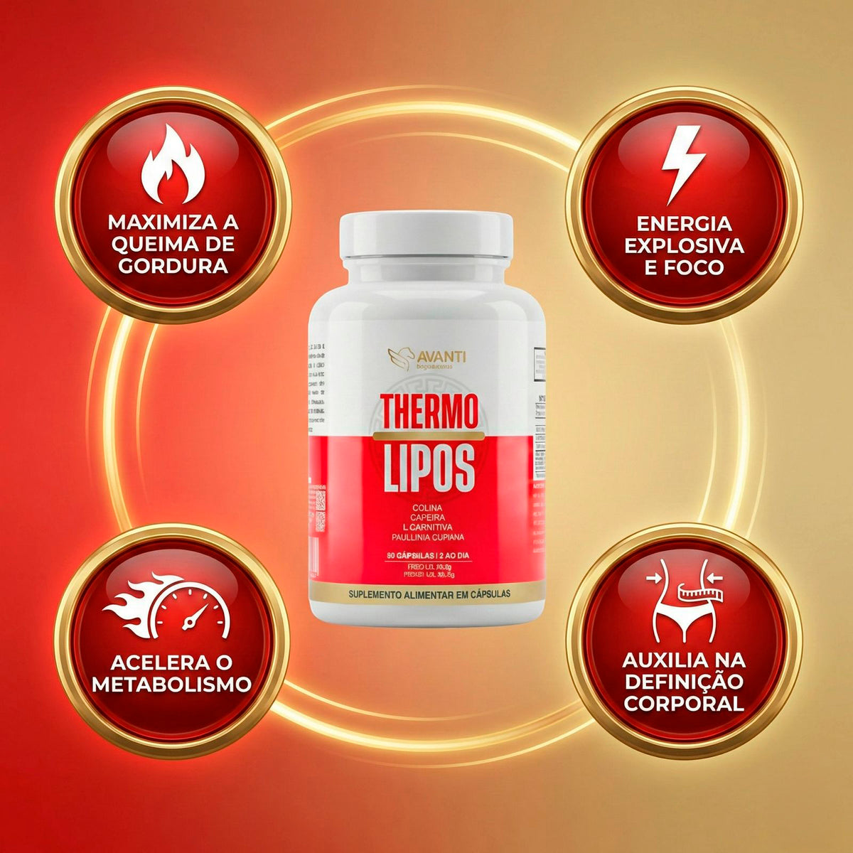 O uso diário do ThermoLipos ajuda a manter o metabolismo mais ativo, favorecendo a utilização da gordura como fonte de energia. Sua ação termogênica contribui para maior disposição e foco, auxiliando no controle do peso e no desempenho físico ao longo da rotina.